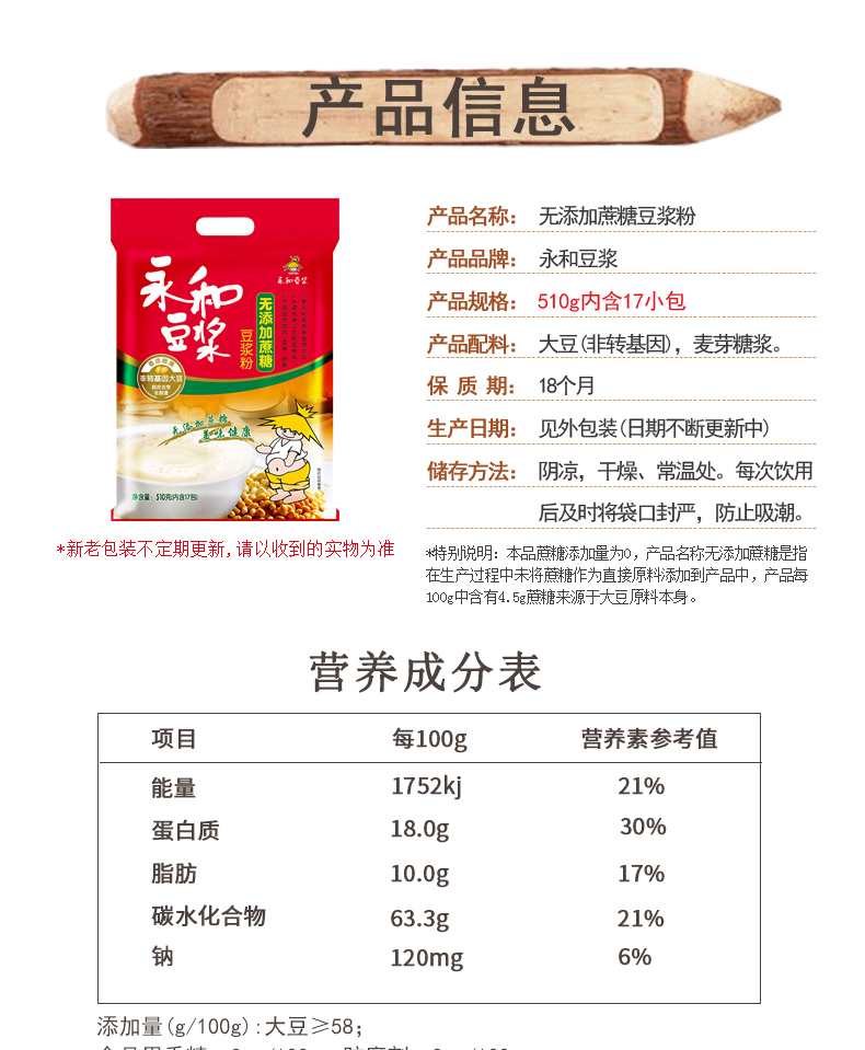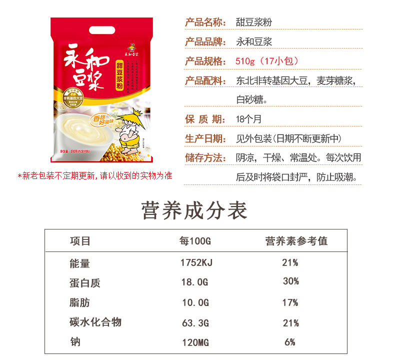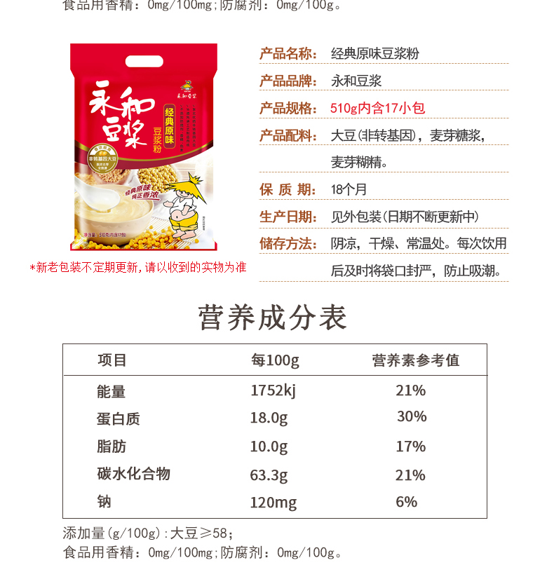 商品名称:永和豆浆 510g/包甜豆浆粉经典原味无蔗糖 速溶豆粉豆奶粉冲饮早餐