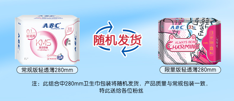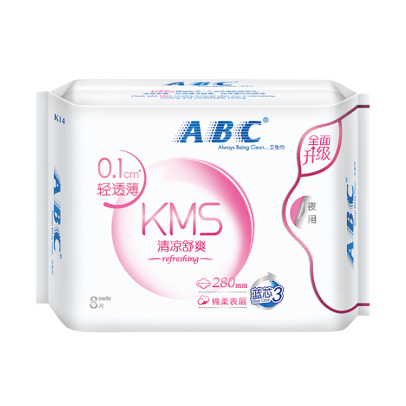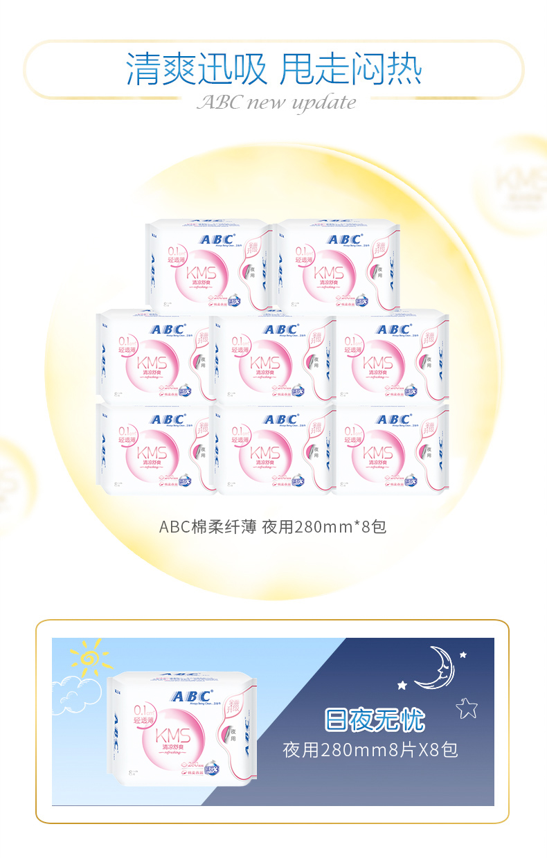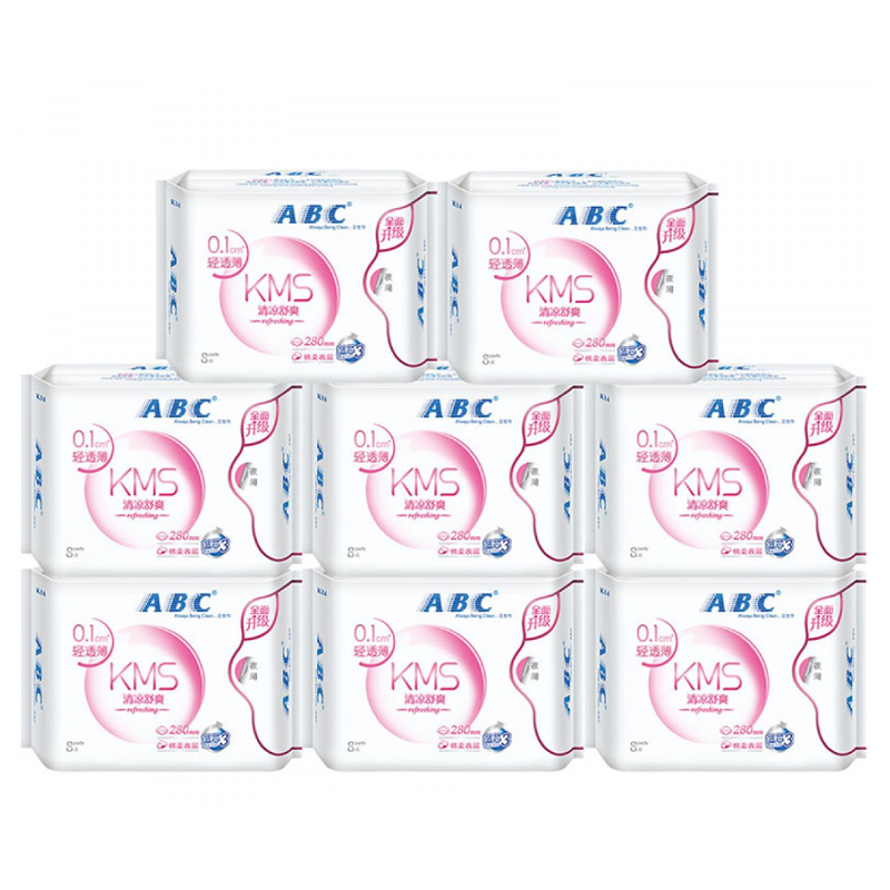 商品名称:ABC 卫生巾0.1cm清凉舒爽夜用防侧漏280mm*8包夜用C44