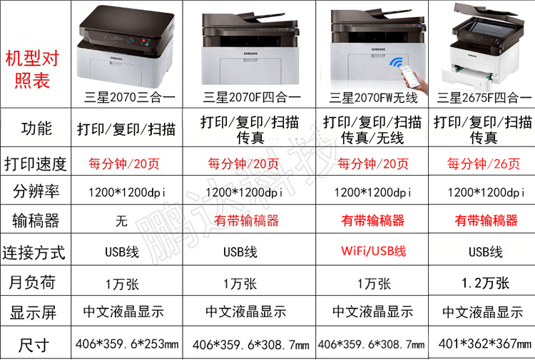 三星2070有线+中文,三星2070F+输稿器,三星2070W+手机WiFi打印,三星2675F带输稿器+纸盒,三星2070FW+手机WiFi+输稿器,套餐顺丰包邮质保三年