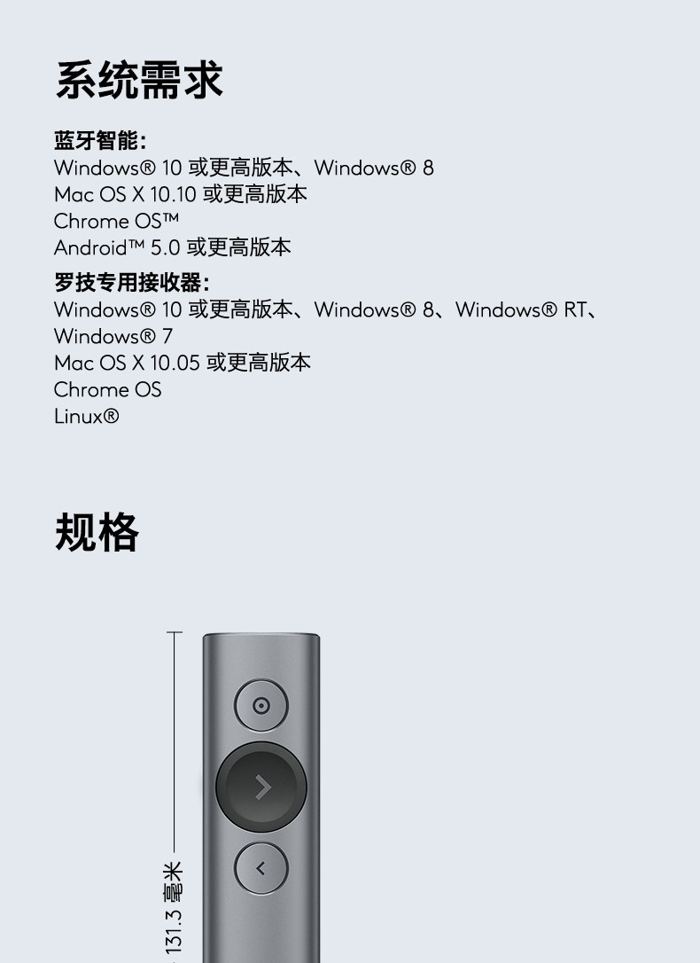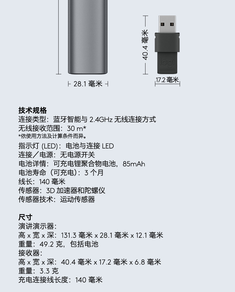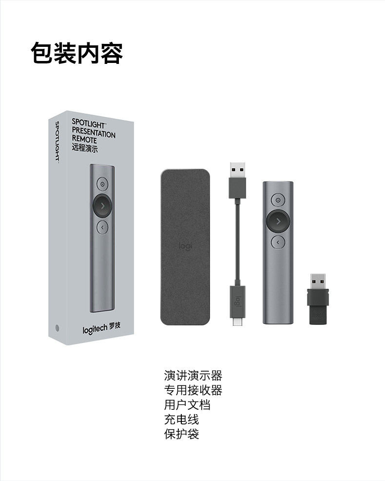 商品名称:罗技 无线演示器 投影笔 翻页器 灰 Spotlight