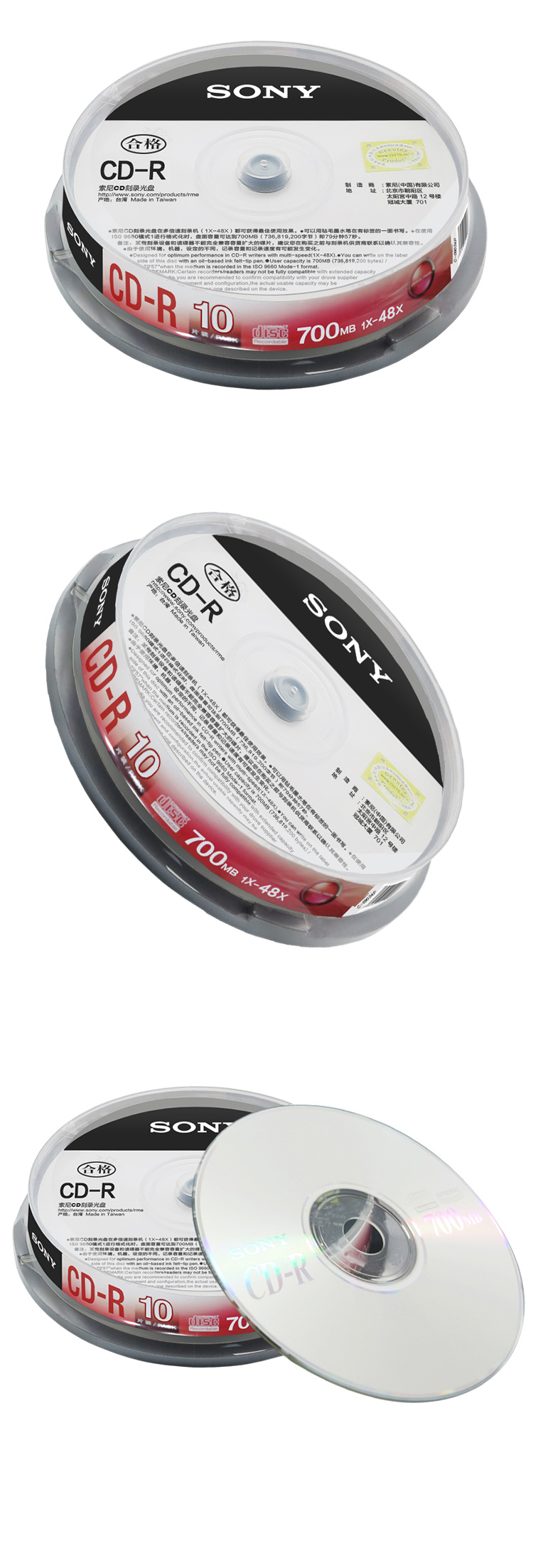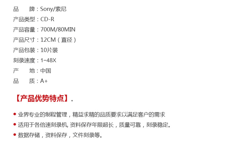 商品名称:索尼 SONY CD-R光盘 刻录盘48速700MB桶装10片空白光盘