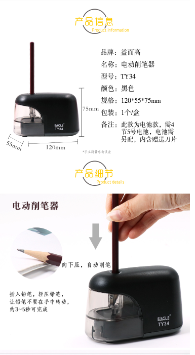 商品名称:益而高 EAGLE TY34 电动削笔器 赠替换刀芯×1 黑色