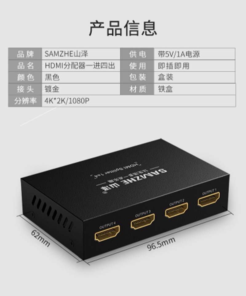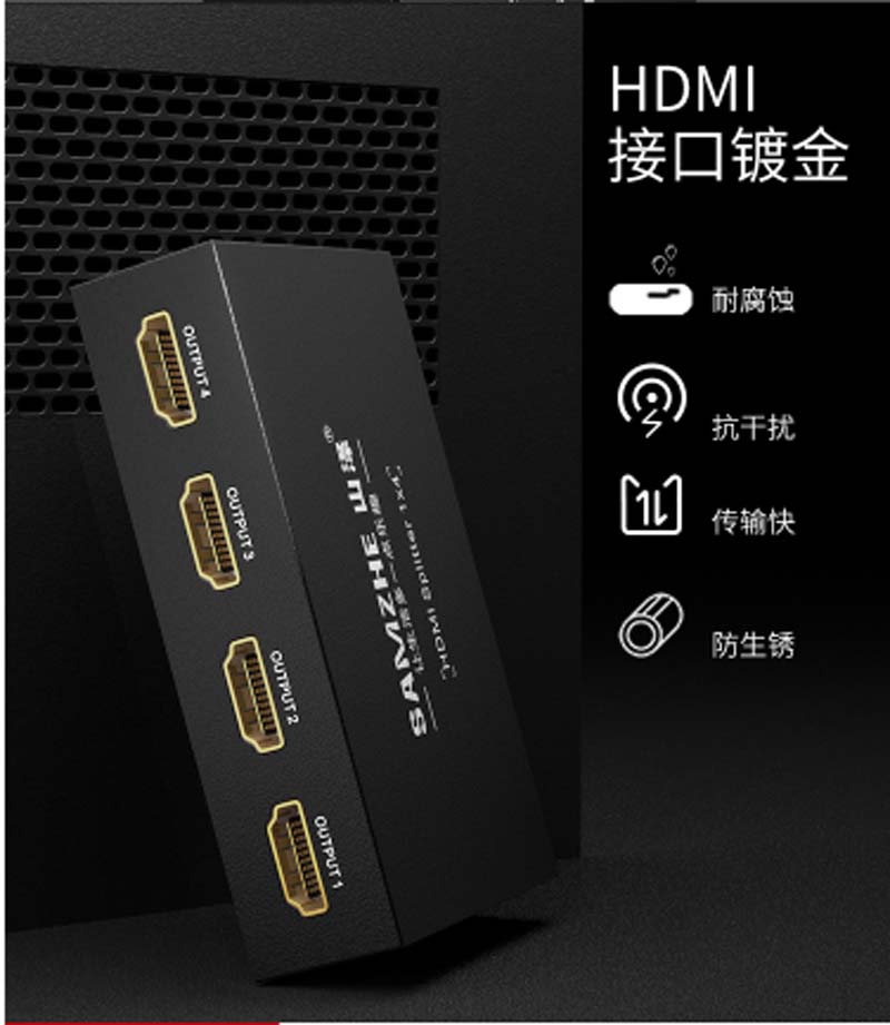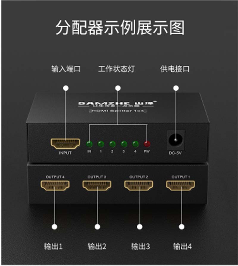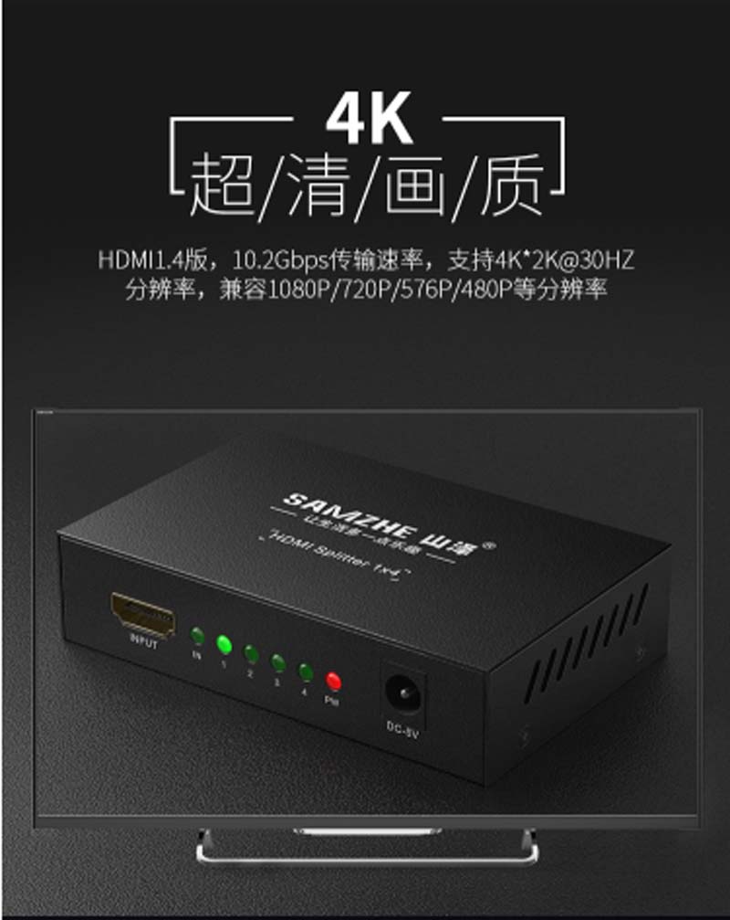商品名称:☆山泽 SAMZHE HDMI一进四出分配器 支持3D 4K数字高清视频1分4一分四分屏器 笔记本连接投影仪HV-504W