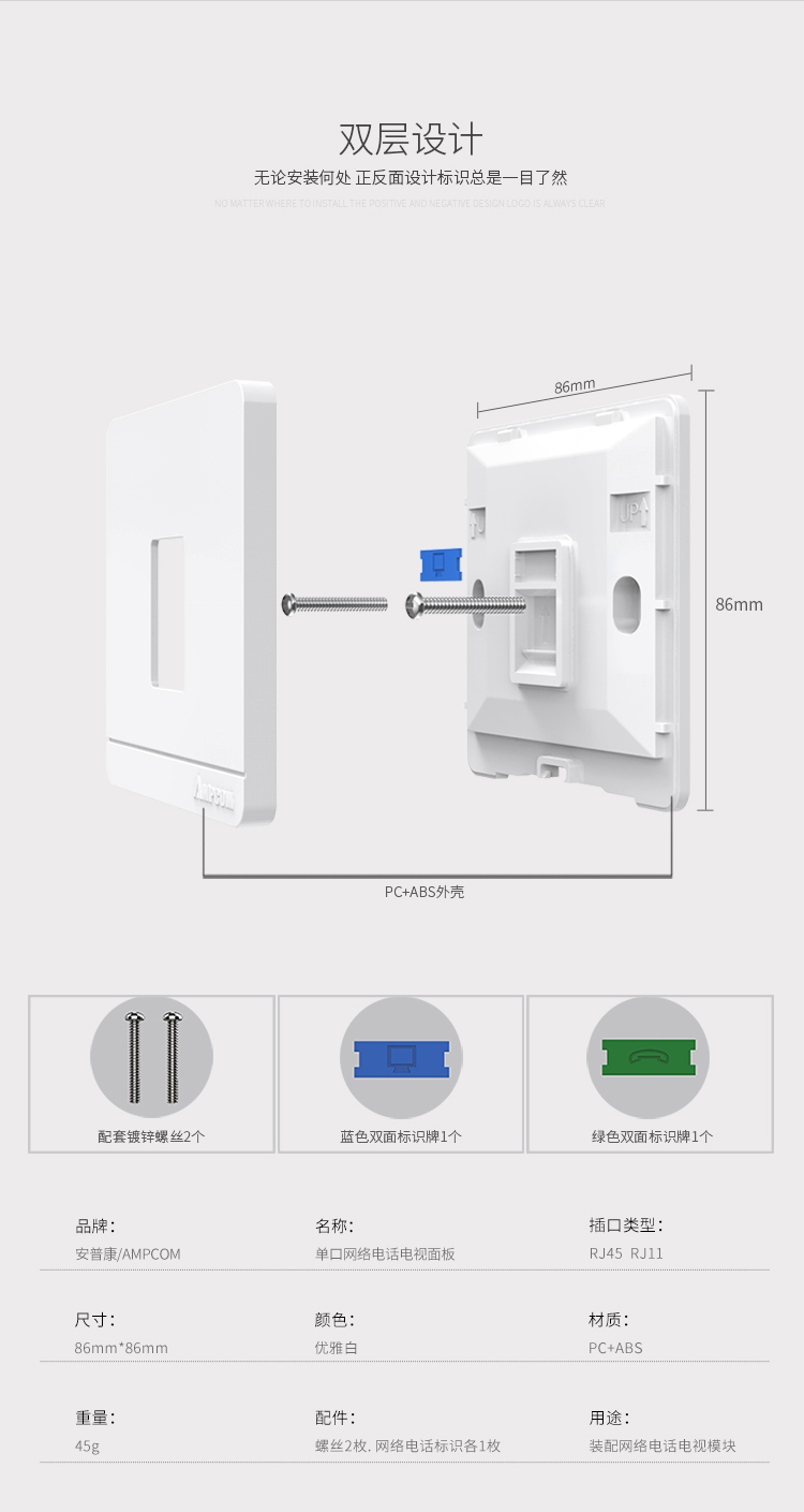商品名称:☆安普康 AMPCOM 一位单口网络面板 工程级电话电视开关插座 AM8601