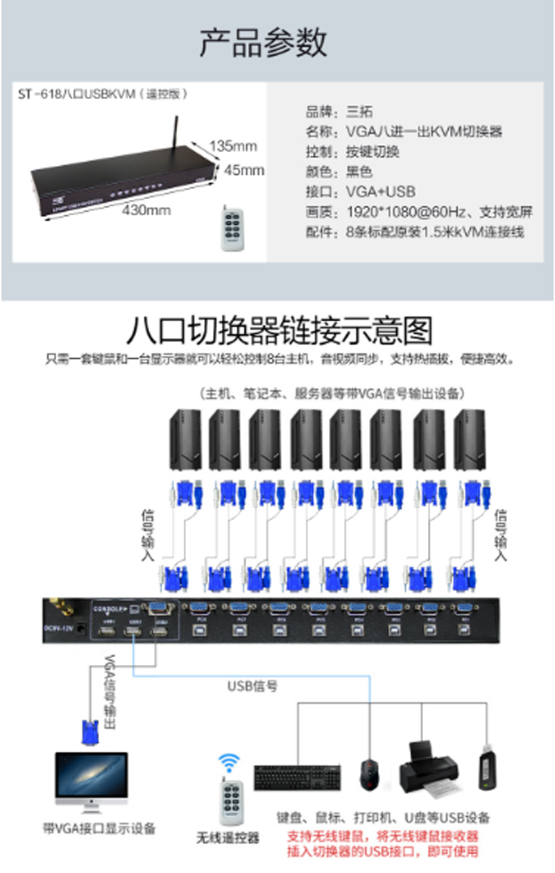 商品名称:☆三拓 ST-618 KVM切换器 8口 八进一出 遥控