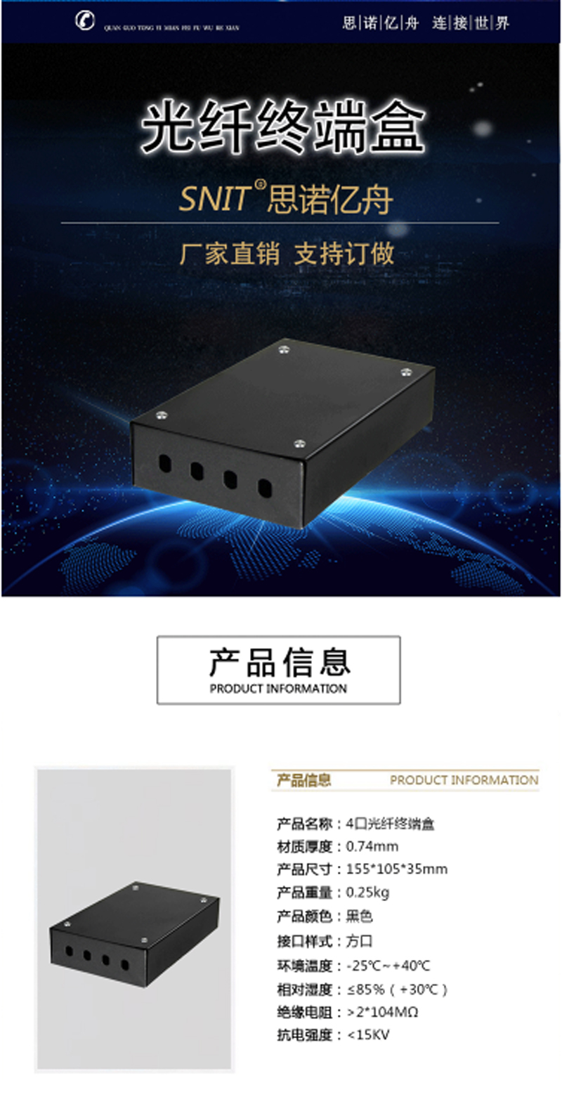 商品名称:☆思诺亿舟 SNIT S952-4-1 桌面式4口FC/ST光纤终端盒 空盒