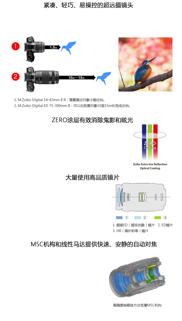 ![]() 以前由于"大・重・贵",一般人轻易无法体验的超长焦领域(等效于35mm的600mm)拍摄,现在通过重量仅423g的小型轻量设计・低价格得以实现。该镜头一些令人匪夷所思的技术使您能够从各个角度拍摄大幅照片。 镜头表面镀有高透光ZERO(Zuiko超低反射光学)涂层,消除了以前难以消除的鬼影和眩光。即使是在逆光拍摄等不利条件下,ZERO涂层仍然获得清晰的画质。 使用2片超级ED(超低色散)镜片和ED镜片来有效地校正降低远摄镜头画质的色差。另外还搭载3片HR(高折射率)镜片,以减小尺寸和校正各种色差,从而在整个焦段内均实现杰出的画质。 MSC(视频静止兼容)机构是光学设计技术的新成果,通过将镜片数目减至较少而获得轻巧镜身,从而实现快速、安静的对焦。取消了齿轮,消除了运转噪声。采用亚微米级金属轴和快速移动的线性马达驱动系统,实现对焦镜片的直接驱动。该镜头的内对焦系统利用MSC机构,并通过由两片粘合镜片组成的紧凑、轻巧对焦单元完成对焦,从而实现快速、安静的自动对焦。自动对焦系统使用户能够自如地拍摄静止图像和视频。 | |||
