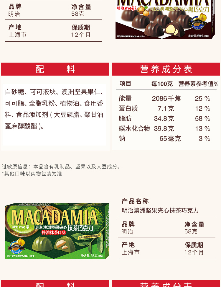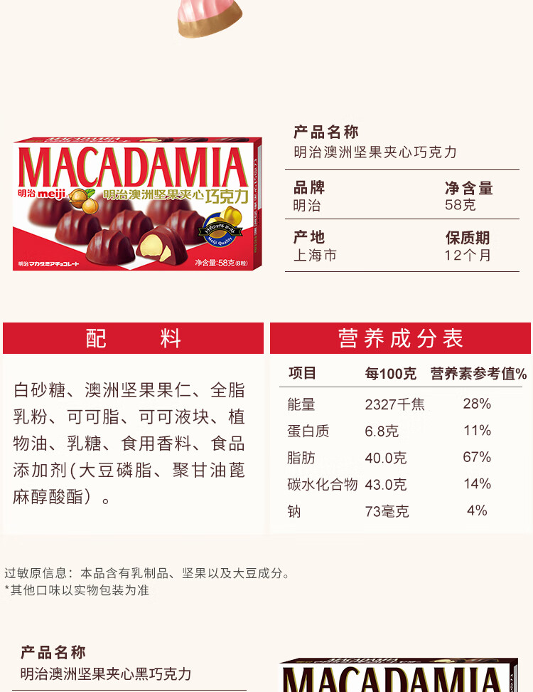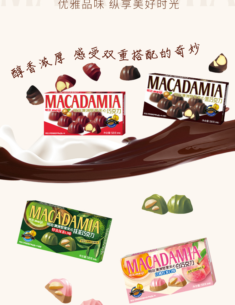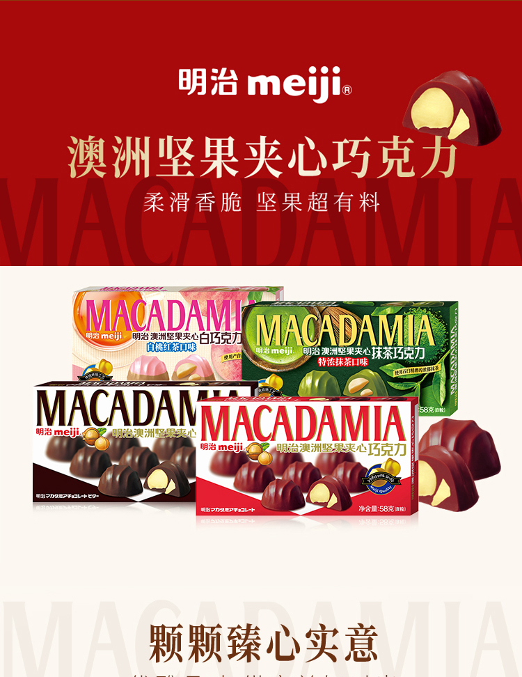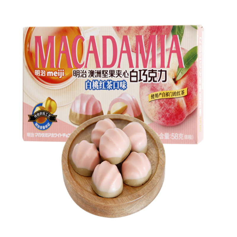 商品名称:明治 澳洲坚果夹心白巧克力白桃红茶口味58克(单位:盒) 926盒起订
