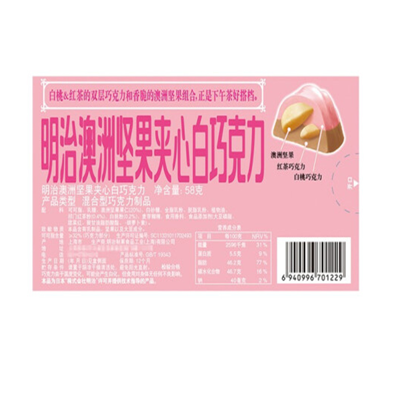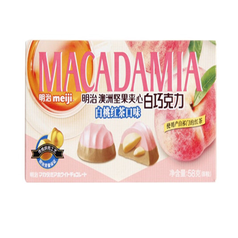 明治 澳洲坚果夹心白巧克力白桃红茶口味58克(单位:盒) 926盒起订