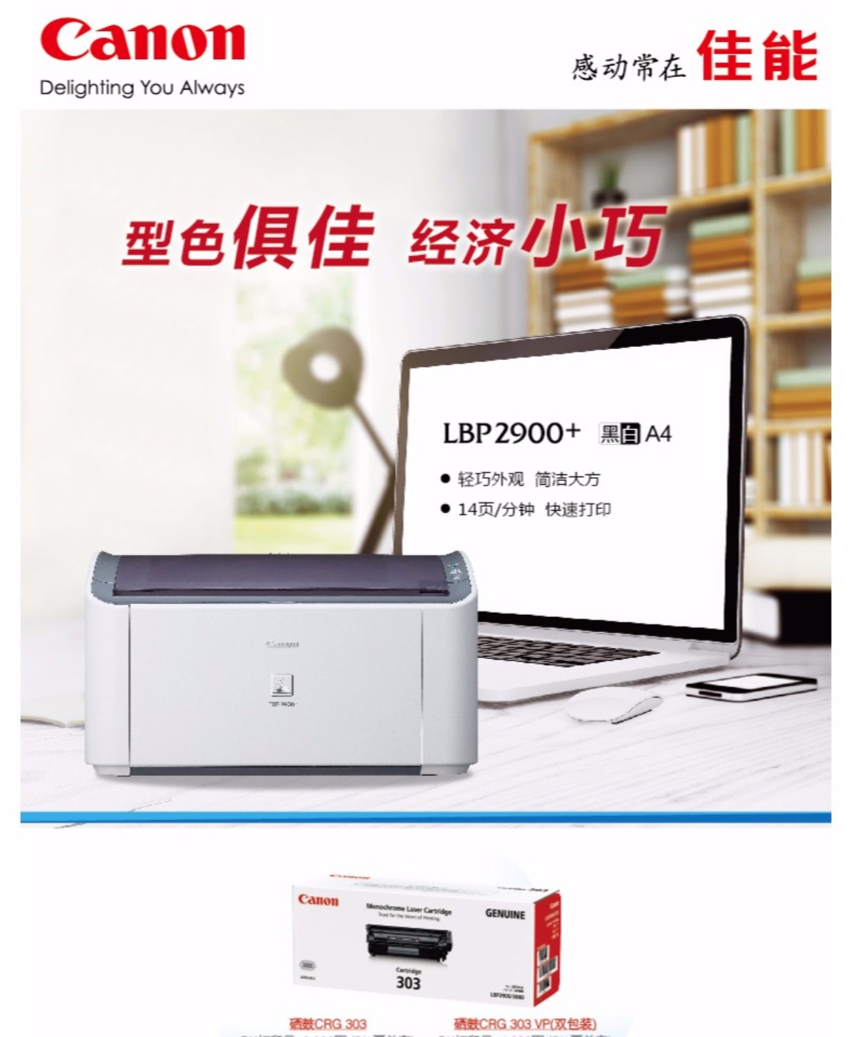 商品名称:佳能(Canon)A4激光打印机(LBP2900+)/A4幅面黑白激光打印机 不支持网络打印 手动双面打印14页/分钟 适配打印耗材:CRG303 一年保修/台
