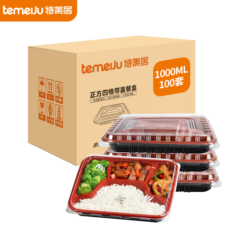 商品名称:特美居 TMJ-083 黑红四格 1000ml*100套 一次性饭盒 箱装