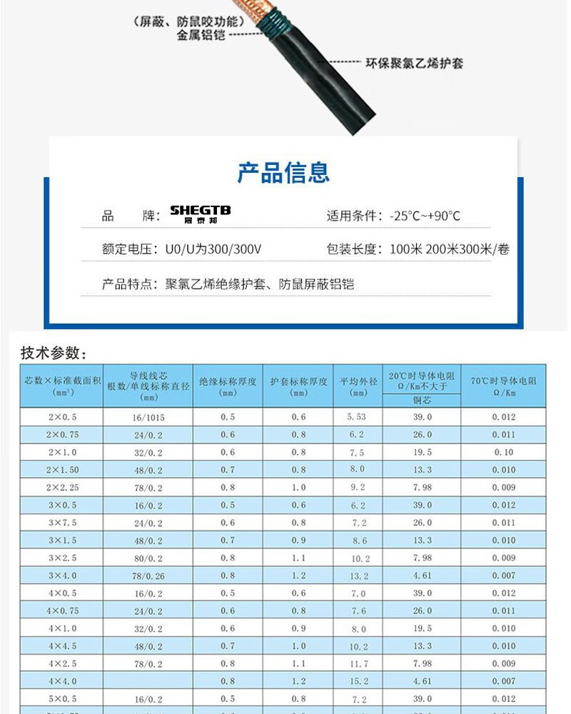 商品名称:晟泰邦 防水防鼠阻燃铠装无氧铜屏蔽线 ZRA RVVP22 200米/卷(单位:卷) 2*1.5