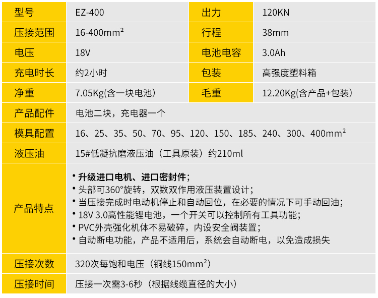 商品名称:春和 电动液压钳 18V锂电池充电式压线钳 电缆压接工具 便携式 EZ-400