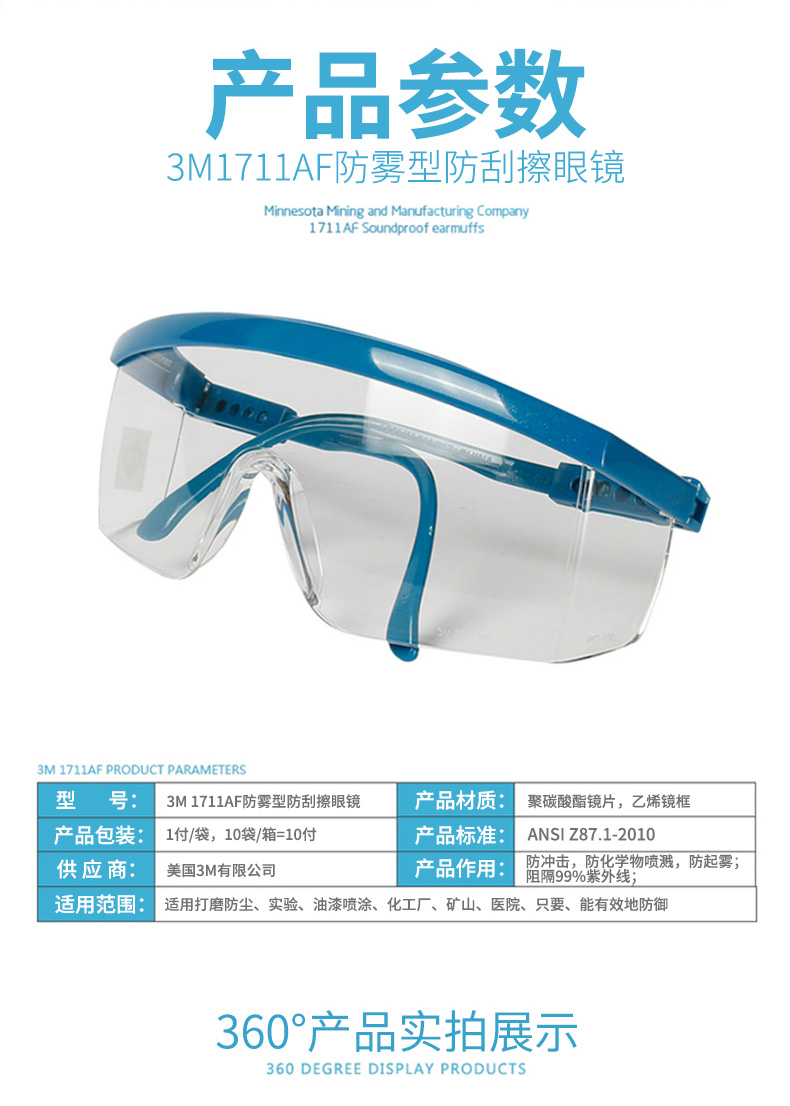 商品名称:3M 1711AF 防雾防护眼镜镜腿可调节防紫外线护目镜防风防尘防冲击