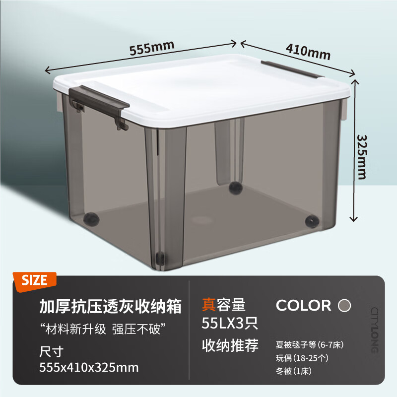商品名称:禧天龙 被子衣服收纳箱大号收纳盒55升3个装 儿童玩具整理箱 文件书籍储物箱 抗压搬家打包箱 透明灰带轮 单位:个