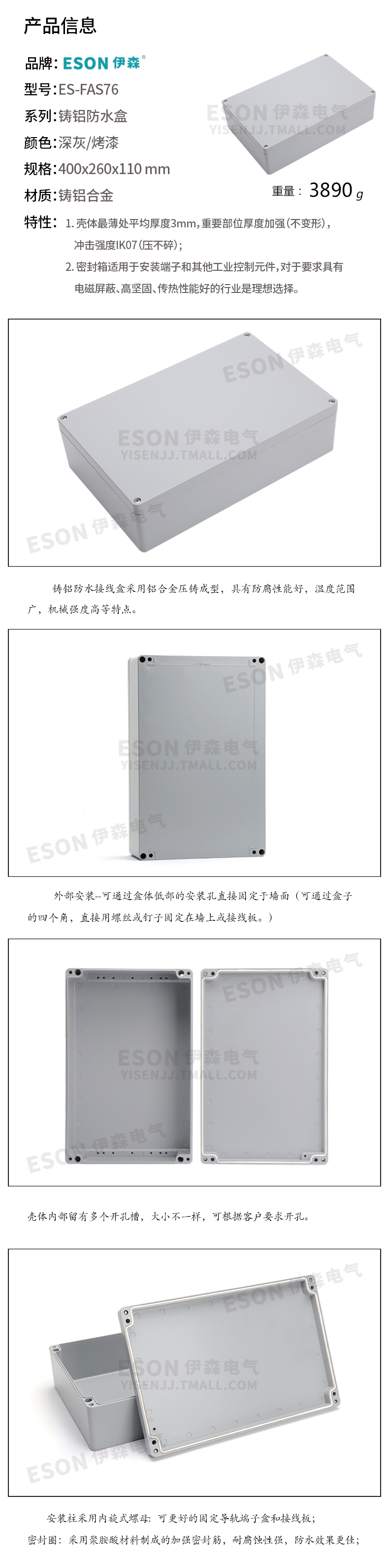 商品名称:伊森 铸铝防水盒 防水铝盒 室外接线盒过线盒端子盒 铝 ES-FAS76