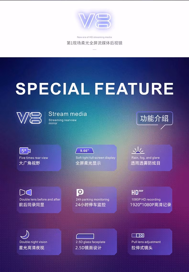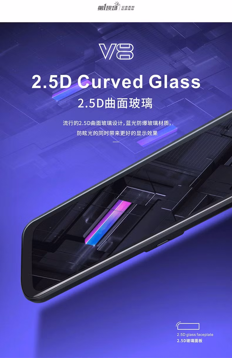 第一现场V8流媒体高清记录仪9.66寸IPS触摸屏前后同显语音声控1080P高清24小时停车监控 官方标配+64G内存卡