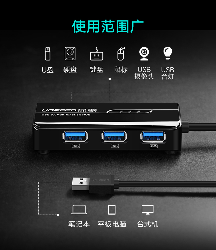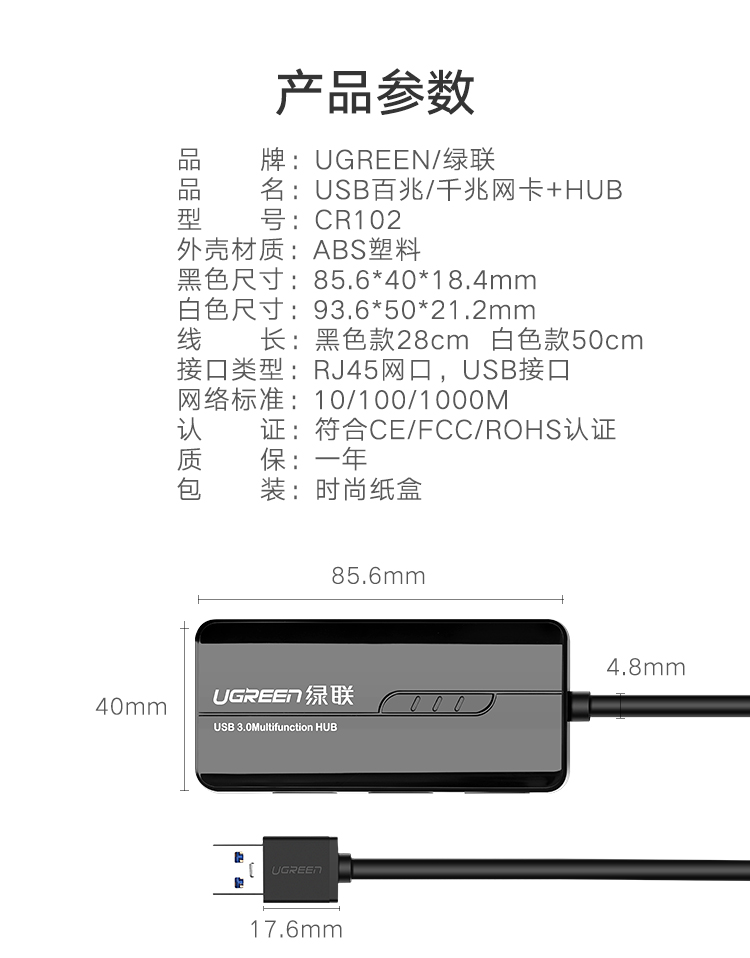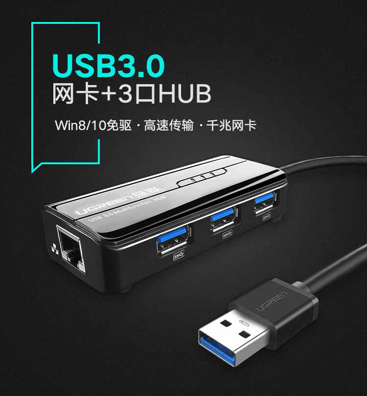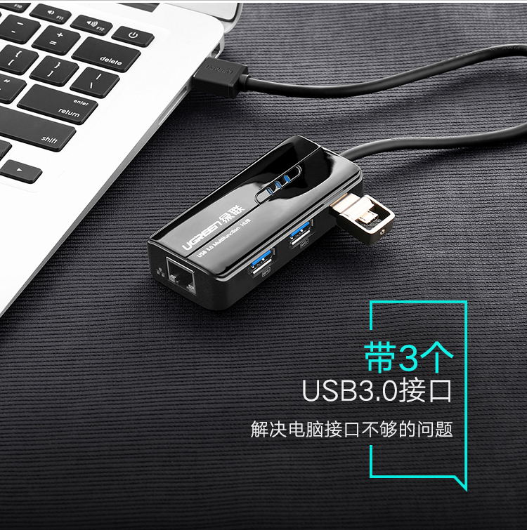 商品名称:绿联usb网卡转换器带3口hub笔记本电脑usb转网线接口百兆千兆网卡外置3.0接口扩展器高速网络支持校园宽带