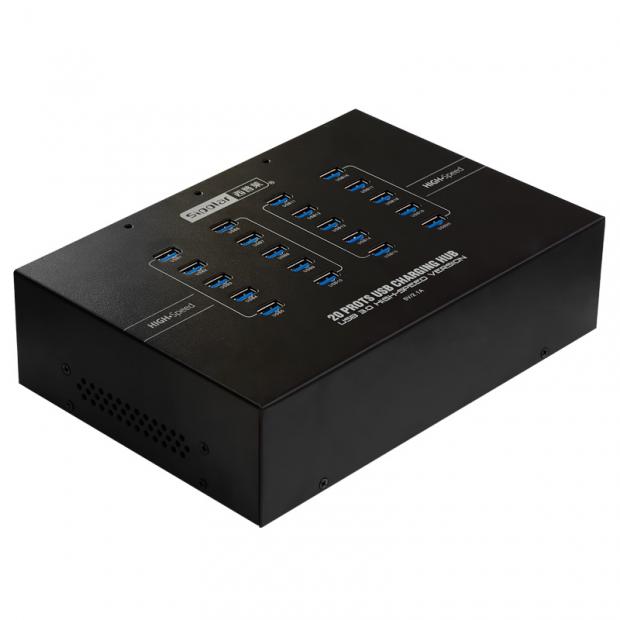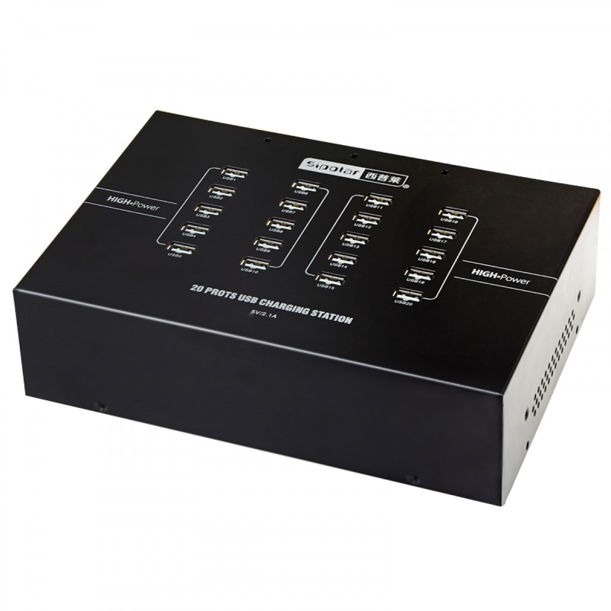 能同时满足20台移动终端(智能手机,平板电脑,移动硬盘,数码相机等)大功率产品同步进行数据传输及充电。每个USB端口提供5V/2100mA的充电电流