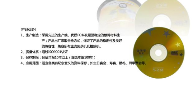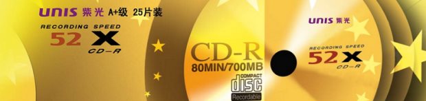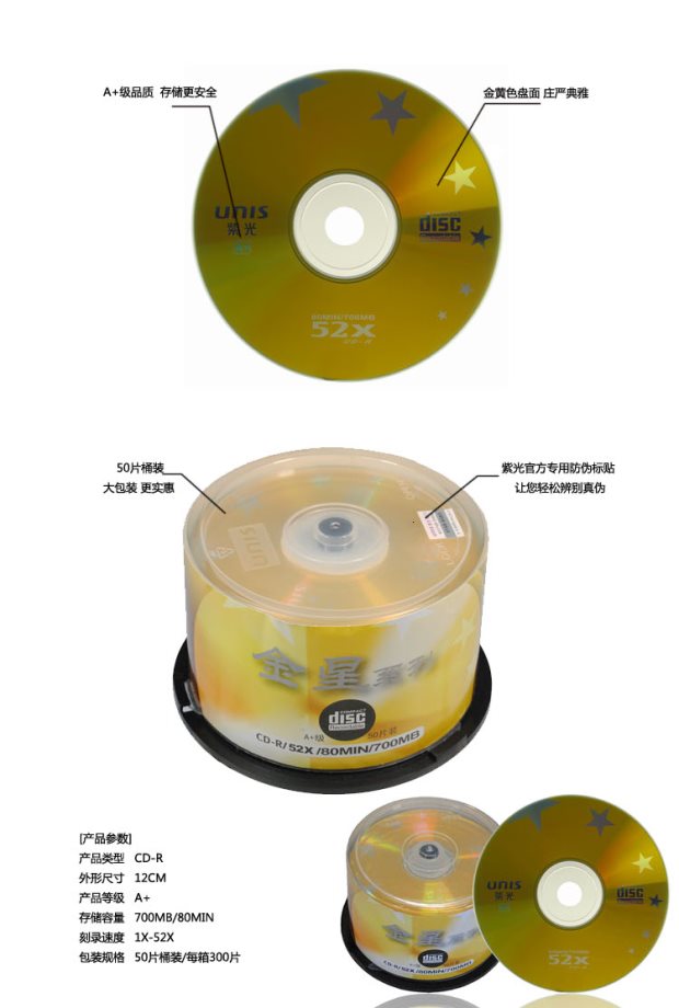 商品名称:清华紫光 金星系列CD-R光盘CDR刻录盘 52X 700MB 50片桶