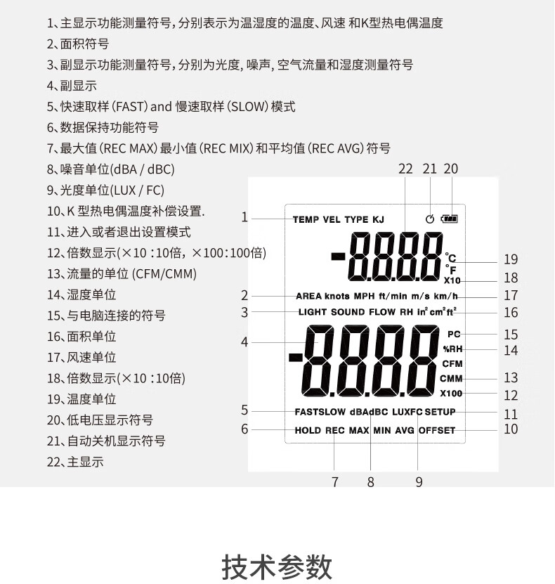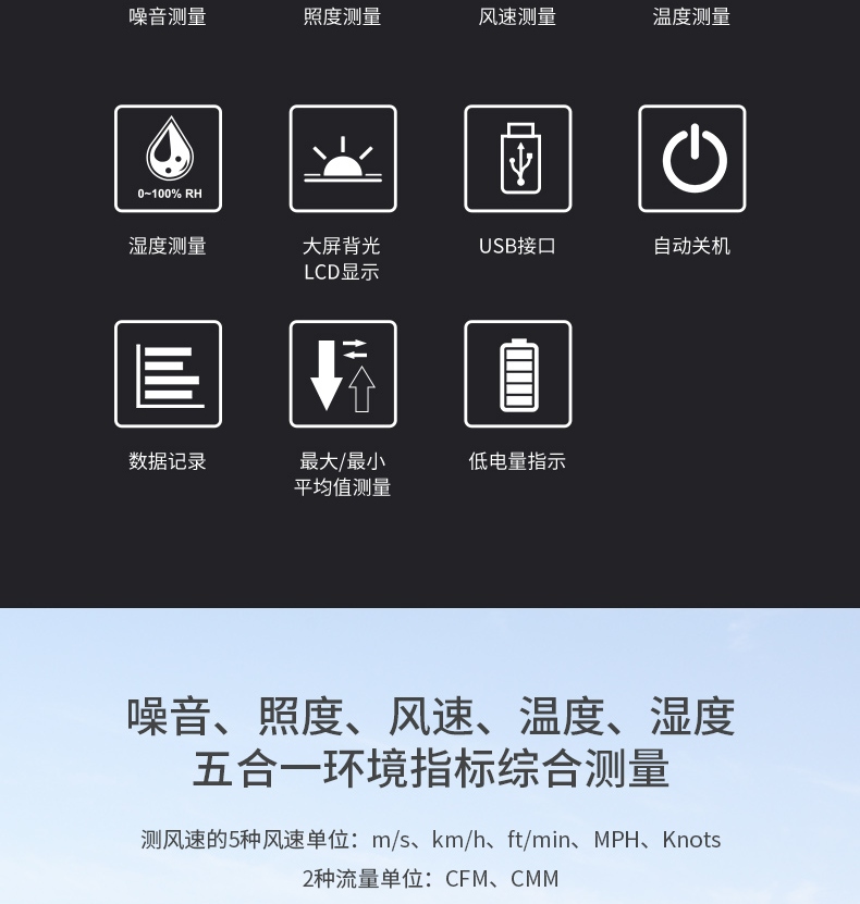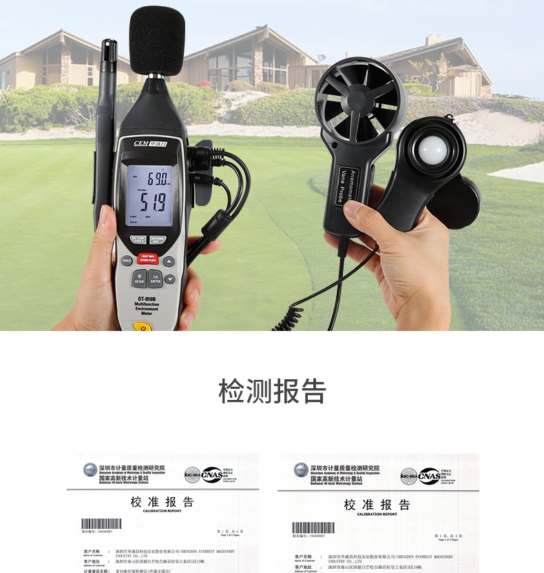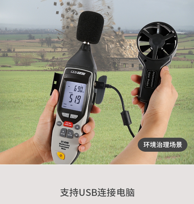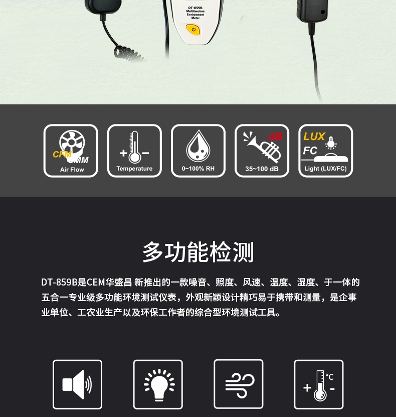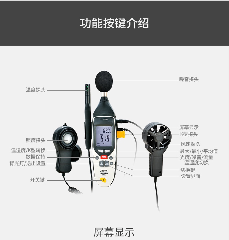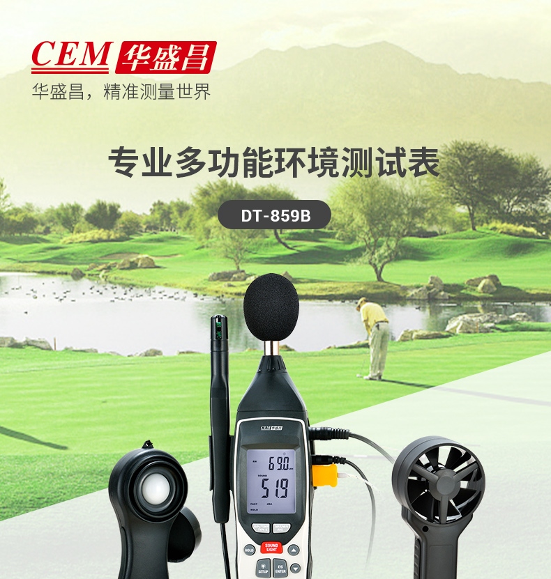 商品名称:华盛昌(CEM)DT-859B专业多功能环境测试表 K型温度 湿度 光度 噪音风速检测仪 五合一功能 单位:台